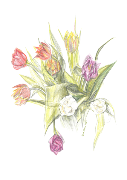 "Symbol wiosny" poster autorstwa Natascha Peters. Kolorowe tulipany rozkwitają na tym rysunku wykonanym kredkami, jakby chciały zaraz wyskoczyć z kartki. Każdy kwiat ma swój unikalny odcień – od różu, przez fiolet, po delikatną biel – a liście dodają im lekkości i naturalnej swobody. To świeże, wiosenne ujęcie kwiatów, które wniesie powiew natury i energii do każdego wnętrza, idealne na oryginalną kartkę czy plakat. Trochę jak wiosenny upgrade dla twojej przestrzeni.