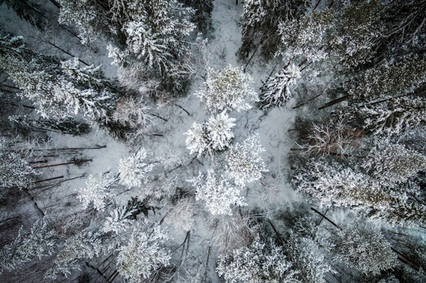 "Drzewa z góry" poster autorstwa Anders Vestin. Zimowy las uchwycony z lotu ptaka – drzewa pokryte świeżym, miękkim śniegiem tworzą niemal hipnotyzujący wzór. Ta minimalistyczna biel i cicha symetria przypominają scenę z innej planety, gdzie czas na moment zwalnia. Idealne dla miłośników chłodnej estetyki i natury w wersji top-down, prosto z serca Norrland. Zimowa magia, która mówi „spójrz, tu jest spokój i porządek”.