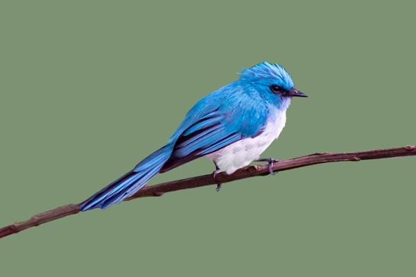 "Tropical Blue Bird sitting on a twig. The African blue flycatcher only lives north and south of the equator in Africa. It is very small with a size of about 18 cm. The sky blue feathers and the white belly let it stand out from other in that region. The photo was taken in Cameroon."