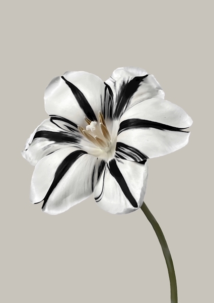 "Kwiat" poster autorstwa Fanny Lindblad. Ten kwiat to nie żaden zwykły tulipan – to prawdziwa czarno-biała gwiazda na beżowym tle. Płatki tańczą niczym w abstrakcyjnym balecie, a ich pasy przypominają odręczne pociągnięcia pędzla, które nadają całości nowoczesnego, skandynawskiego sznytu. Minimalizm w najlepszym wydaniu, który jednocześnie przyciąga wzrok i intryguje detalami. Idealny dodatek, który ożywi każde wnętrze i zrobi wrażenie bez zbędnego krzyku.