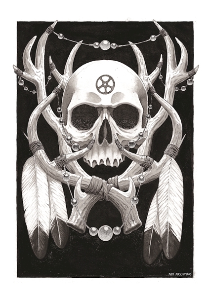 "Rogaty Bóg" poster autorstwa Bart Boschmans. Czaszka z porożem i piórami – trochę jakby ktoś zrobił totem survivalowy po nocnym seansie horrorów. Detale jak koraliki i węzły tworzą klimat, który mówi: „przetrwałem, więc jestem”. Czerń i biel grają tu w kontrasty, które wciągają jak najlepszy thriller. Idealne dla tych, którzy lubią sztukę z pazurem i historię ukrytą między rysami. To nie tylko obraz – to manifest.