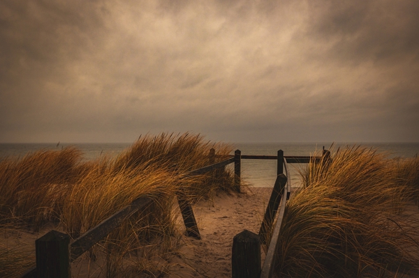 "A dark and moody wide angle shot on a quiet autumn afternoon of the baltic sea from the viewpoint of Graal-Müritz beach, Mecklenburg Western Pomerania."