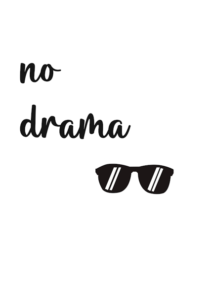 "No Drama" poster av Lars Gustafsson. En svartvit poster som säger allt utan att skrika – "no drama" med en cool solglasögon-twist som liksom bara säger chill out. Minimalistisk men med attityd, perfekt för den som vill ha lite mer zen och lite mindre kaos i vardagen. Sätt upp den och låt budskapet tala för sig själv – enklare än så blir det inte. Enkelt, snyggt och med en vibe som aldrig går ur tiden.