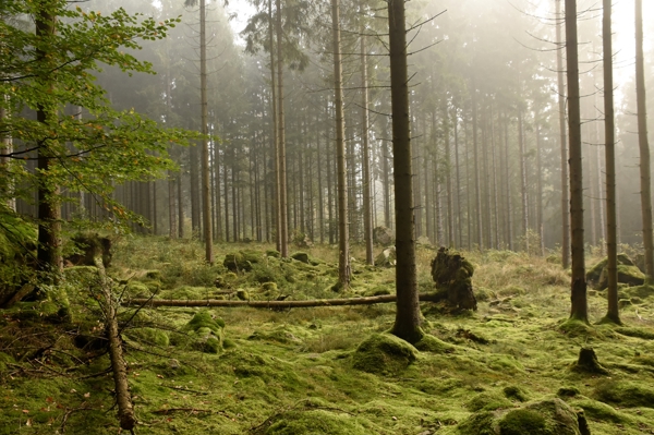 "Mystisk troll skog med härlig dimma som höjer stämningen i bilden"