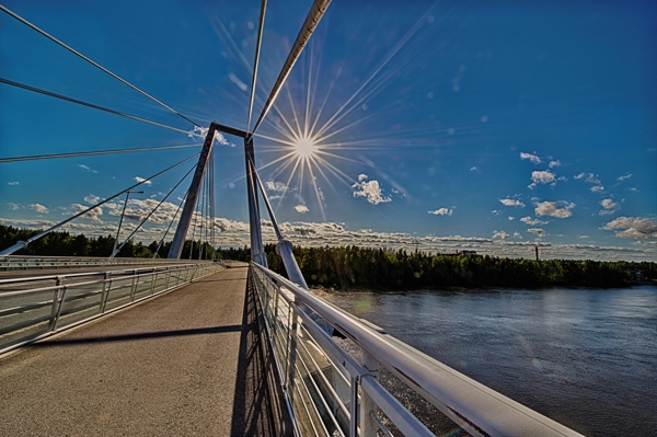 "Bron" poster av Lars-Åke Jonsson. Bron i Umeå fångar solens strålar som om de vill nå himlen – ett perfekt möte mellan stadens arkitektur och naturens lekfulla ljusspel. Den rena, moderna designen skär rakt igenom den klarblå himlen med fluffiga moln som bakgrund. Det är som att stega rakt in i en framtid där varje steg är en inbjudan till äventyr och upptäckter. Typiskt Umeå-vibes, fast med extra solkysst attityd.