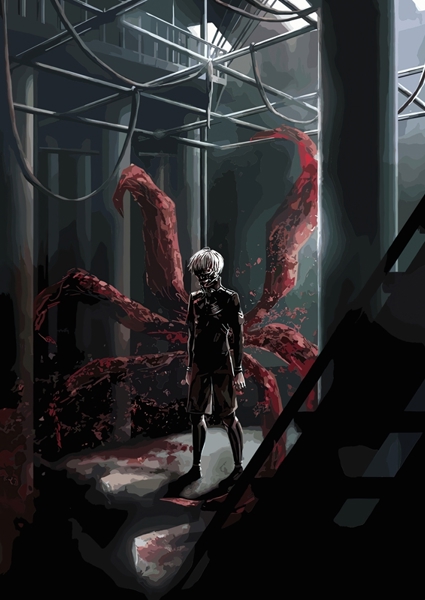 "Tokyo Ghoul Anime" poster av jon varhamet. En ensam gestalt står i skuggorna av en nedgången, industriell miljö – och bakom sig har hen åtta blodröda, tentakelliknande armar som för tankarna direkt till Tokyo Ghoul. Det är mörkt, kallt och samtidigt nästintill hypnotiskt – som en scen från en dystopisk dröm där varje vrå berättar något om kamp och överlevnad. Perfekt för den som vill ha en konstbit som både skrämmer och fascinerar, och som väcker nyfikenhet varje gång man går förbi.