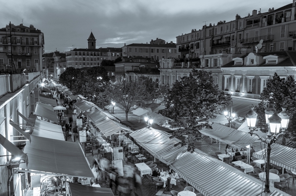 "Black and white photography of restaurants, pubs and cafes on the Cours Saleya square in Nice at night"
