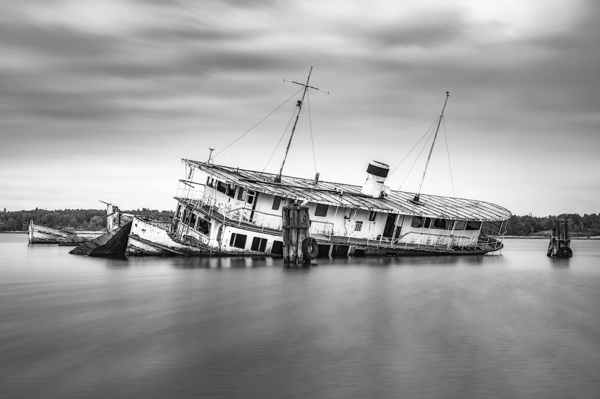 "Vraket" poster av Mikael Svensson. Ett skeppsvrak i Bråviken som långsamt sjunker och smälter in i vattnet – svartvitt och drömlikt. Molnen snurrar runt, som om tiden stannat och naturen långsamt tar tillbaka sin plats. Det här är inte bara en bild på ett förlist fartyg, utan en melankolisk berättelse om något som en gång var stolt och nu bara är ett spöke i landskapet. Perfekt för dig som gillar när konst spelar på känslan av förfall och tidens gång.