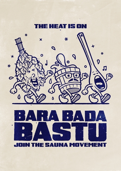 "Bara bada bastu" poster av PEPKIX. En lövkvast, en bastufat och en sked med armar och ben – alla på gång, svettiga och glada. Texten ”Bara Bada Bastu” sätter tonen direkt, som en peppig inbjudan till bastukulturen med en oväntat lekfull twist. Det är som om hela gänget ropar ”häng med, det här är ju livet!” och värmen sprider sig både i bild och text. Perfekt för alla som tycker att bastu är mer än en ritual – det är en fest.