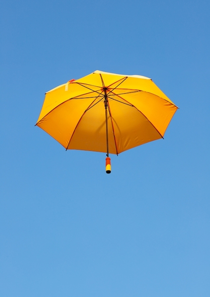 "Orange paraply svävar av frihet mot en klarblå himmel."