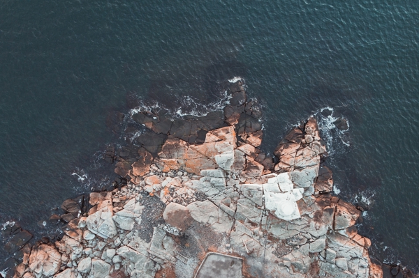 "Drone shot 2" poster av Lucas Lindfors. En nästan abstrakt vy från ovan där havets djupblå möter den karga, steniga kusten i Karlshamn. Det är som att naturen själv målar med jordtoner och skarpa kanter, medan vågorna försiktigt smeker klipporna. En perfekt bild för den som vill ha en bit av Sveriges råa kustlinje – fast med en twist som känns både lugn och vild på samma gång. Lite som att sitta i en futuristisk fågelperspektivdröm.