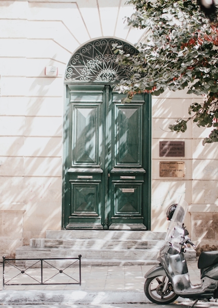 "50 nyanser av grönt" poster av Anna Drakou. En grön dörr i soliga Chania, där skuggorna från trädkronor leker över träets yta och skapar ett levande mönster. Det är som att dörren bjuder in till något oväntat – en paus från stadens puls, en stunds lugn i den venetianska hamnens charm. Perfekt för den som vill fånga Medelhavets lätta vibe och addera lite arkitektonisk stil till väggen. Liksom, vem kan motstå?