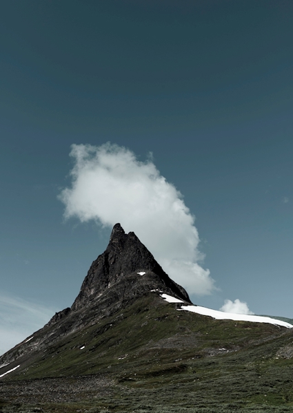 "Kungsleden" poster av Natasja Kamenjasevic. En spetsig topp som sticker upp mot en nästan overkligt klar himmel – och mitt i allt svävar ett moln som liksom dansar ovanför berget. Det är Nallo, mitt i Kebnekaises vildmark, där is möter sten och naturens krafter tyst berättar om klimatförändringarna. Det är som att stå mitt i Lapplands hjärta, där det vilda aldrig slutar fascinera. Så rått, så vackert – och lite som en cool påminnelse om vad som håller på att förändras.