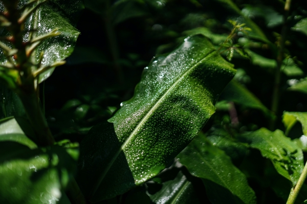 "Exotic green leaf" poster by Oksana Zagoruy. Keywords: plant, green, leaf, exotic, forest, dew, drops, water, coneflower, hedychium, shadow, sun, botany, tropical.