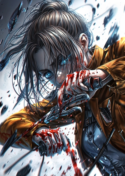 "Mikasa Ackerman" poster by Bianca Isabella. Dive into the fierce world of anime with this striking artwork featuring Mikasa Ackerman. Captured mid-action, she wields her swords with a fierce intensity, blood splattering against her iconic jacket. Those piercing blue eyes? They scream determination and survival. It’s not just a scene; it’s a moment frozen in time, embodying the spirit of a true warrior. Perfect for any Attack on Titan fan, this piece brings the thrill of combat right into your space.