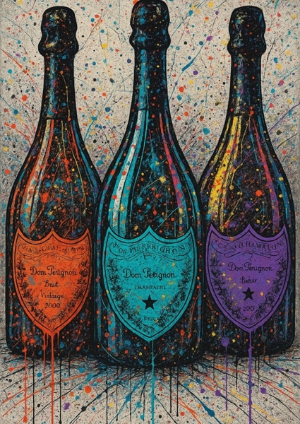 "Celebrate luxury and color with this striking pop art piece! Featuring three iconic Dom Pérignon bottles, this artwork bursts with energy through bold splashes of orange, turquoise, and violet. A dynamic fusion of elegance and street-art flair – perfect for those who love champagne, creativity."