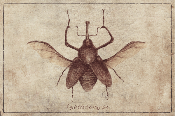 "This artwork depicts a detailed illustration of an insect, labeled "Gyrbotracheulus Dux." The vintage style and sepia tones give it a classic, scientific illustration vibe, perfect for entomology enthusiasts and nature art collectors."