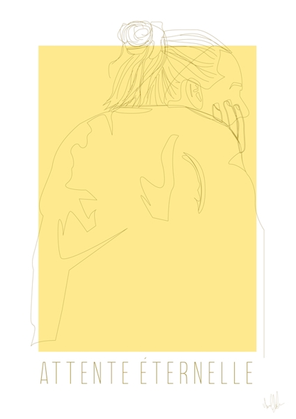 "Eternal wait" poster by Amanda Ekström. A striking linear depiction of a woman lost in thought, set against a vibrant yellow backdrop. This artwork captures the essence of longing and nostalgia, reflecting a time when social connections felt distant. The minimalist lines evoke a sense of simplicity while conveying deep emotions—like a daydream of gatherings and laughter, now just a memory. Perfect for those who appreciate art that resonates with the shared experience of waiting for better days.