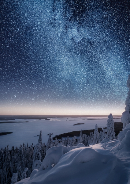 "Milkyway" poster by Carl Schnell. A breathtaking winter night unfolds in this artwork, where the Milky Way stretches across the sky, framing a solitary tree silhouette. The star-studded expanse glimmers with clarity, contrasting beautifully against the soft glow of city lights in the background. It's nature's canvas, blending cosmic wonder with urban charm. This piece invites viewers to lose themselves in the vastness above, sparking a sense of awe and connection to the universe. Perfect for those who crave a touch of celestial magic in their space.