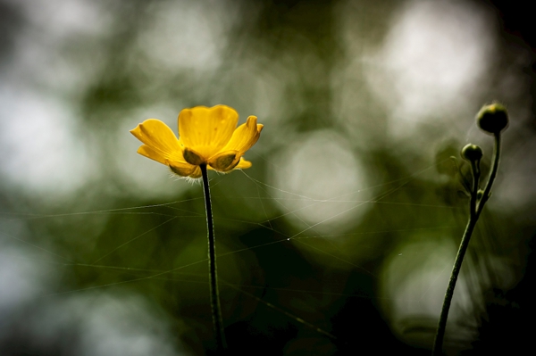 "Butter flower on the meadow" poster by Klas Andersson. A vibrant yellow buttercup stands tall against a dreamy, blurred backdrop, capturing the essence of a sunlit meadow. The delicate petals seem to glow, almost like nature's own spotlight. Wispy spider silk weaves a subtle narrative, hinting at the hidden life around it. This artwork embodies the carefree spirit of summer, where every flower tells a story, and the grass whispers secrets of the past. Perfect for those who appreciate the beauty in simplicity and the magic of the outdoors.