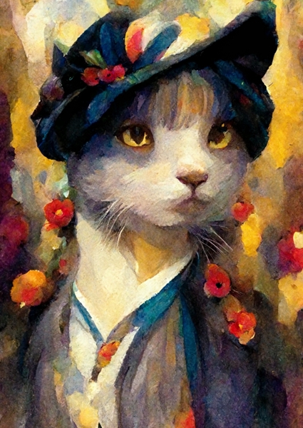"Cat with Style" poster by Winnie Møller. A stylish feline steals the spotlight in this vibrant portrait. Dressed to impress, this cat rocks a chic hat adorned with flowers, exuding an air of confidence and charm. The abstract brushstrokes create a dreamy, colorful backdrop that enhances its personality. It's like a whimsical fashion statement straight out of a fantasy world. Perfect for cat lovers and art enthusiasts alike, this piece adds a playful touch to any space.