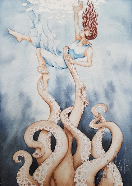 "The octopus" poster by Julia Günther. Dive into the depths of this mesmerizing watercolor piece, where a girl floats amidst the eerie embrace of an octopus. The deep blue sea sets a haunting backdrop, capturing that unsettling vibe of the unknown. Tentacles twist and curl, almost inviting yet undeniably scary. It’s a fantasy world that feels both enchanting and perilous. Perfect for those who appreciate art that stirs the imagination and evokes a sense of wonder. Embrace the mystery!