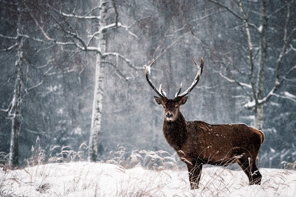 "Deer in the snow" poster by Daniela Beyer. A majestic deer stands tall against a snowy backdrop, embodying the serene beauty of winter. The soft flurries dance around its antlers, creating a magical atmosphere in the quiet forest. Rich browns contrast with the pure white snow, capturing the essence of wildlife photography. This artwork invites a moment of stillness, where nature's elegance takes center stage. Perfect for those who appreciate the wild and the tranquil, it’s a striking piece that brings the winter forest into any space.