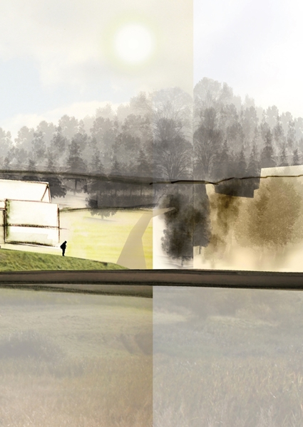 "A water color mixed with photography of a landscape in Hobro Denmark, calming and minimalist."