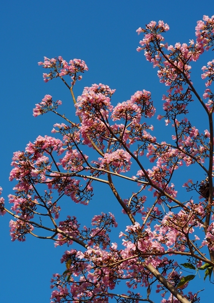 "Beautiful pink flowers" poster by Wisga Photography . A vibrant display of tabebuia flowers bursts against a clear blue sky, creating a stunning contrast that’s hard to ignore. These pink blooms, with their delicate petals, seem to dance in the sunlight, embodying the essence of springtime beauty. The branches stretch out, inviting a closer look at nature's artistry. Perfect for adding a splash of color to any space, this artwork captures the fleeting moments of floral bliss in East Java.