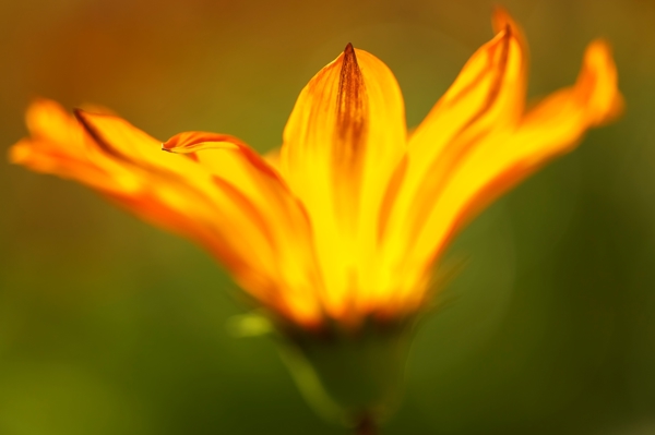 "Fire Flower" poster by Patrik Wennerlund. A vibrant orange flower bursts forth, almost as if it's igniting in flames. Its petals, with delicate lines, create a mesmerizing dance of color against a soft, blurred backdrop of greenery. This piece captures the essence of nature's fiery beauty, inviting viewers to lose themselves in its warmth. Perfect for those who appreciate the outdoors and the striking allure of floral art. Bring a touch of the garden into your space with this stunning visual.