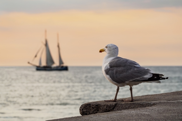 "Sailing ship and seagull on the pier in Warnemunde during the Hanse Sail in Rostock."