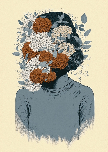 "Woman with a flowery face" poster by Karl Kubik. A striking illustration of a woman whose face is artfully obscured by a vibrant bouquet of flowers. The retro vibe and grainy texture give it a nostalgic yet timeless feel. This piece speaks volumes about female empowerment and the masks women wear in society. The blend of earthy tones and soft blues creates a captivating contrast, inviting viewers to reflect on beauty and strength. Perfect for those who appreciate surrealism and floral art with a twist.