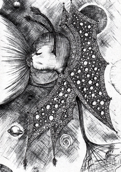 "Nourished by Universe" poster by Petra Temizsoy. This artwork captures a surreal blend of human and cosmic elements, where a serene figure is cradled by the universe. Intricate patterns and celestial motifs intertwine, suggesting a deep connection to Mother Earth and the cosmos. The delicate balance of dreams and reality is palpable, inviting viewers to explore their own spiritual journey. It's a visual feast that resonates with the idea of being nourished by the universe—perfect for those who appreciate art that transcends the ordinary.