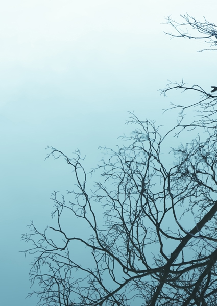 "Wood mirrored in water" poster by Ida Haugaard Olsen. Crooked black branches stretch across a dreamy, hazy sky, perfectly mirrored in the calm waters below. The palette dances between bright whites and soft gray-blues, creating a serene yet striking contrast. It's like nature's own abstract painting—simple, yet deeply evocative. The reflection pulls you in, inviting thoughts of tranquility and introspection. Perfect for those who appreciate the beauty in minimalism and the art of nature.