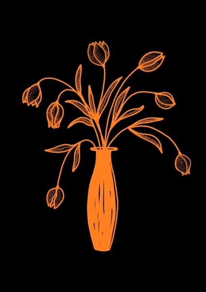 "Illustration of a bunch of tulips in vase painted with digital brushes and pencils in orange on black background. "