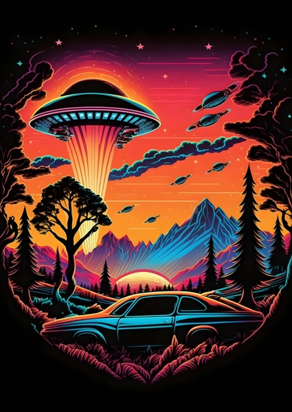 "Ufo Spaceship in the Forest" poster by Max Ronn. A vibrant fusion of retro and cosmic vibes, this artwork captures a UFO spaceship beaming down in a mystical forest. A sleek vintage car rests in the foreground, perfectly blending with the surreal landscape of towering mountains and lush trees. The sunset radiates electric hues, while planets float in the cosmic backdrop. It’s a playful nod to nostalgia and fantasy—perfect for those who dream of adventures beyond the stars. Ideal for any space enthusiast or retro lover!