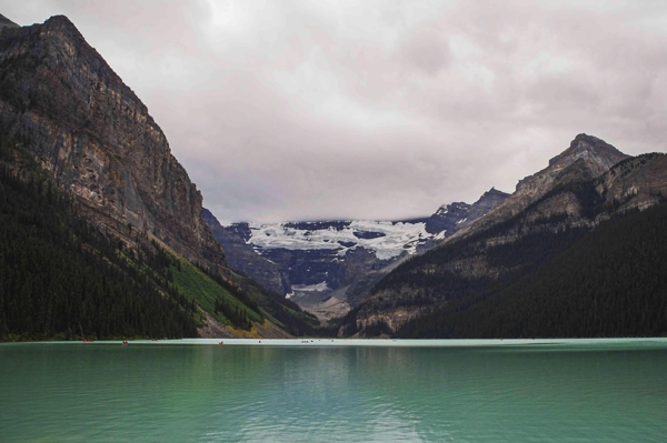 "Lake Louise Landscape" poster by Hendrik Zahn. This stunning landscape captures the serene beauty of Lake Louise, nestled between towering mountains. The tranquil turquoise waters reflect the dramatic peaks and the hint of a glacier above, creating a breathtaking contrast. Overcast skies add a moody vibe, inviting contemplation. Perfect for those who appreciate nature's raw elegance, this artwork transports viewers to a peaceful retreat in Canada, where every glance feels like a breath of fresh mountain air. Ideal for any space craving a touch of the great outdoors.