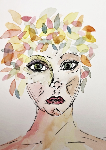 "Flowergirl" poster by Anette Gustafsson. A striking portrait that blends emotion and nature, this artwork features a woman adorned with a vibrant crown of pastel leaves. The watercolor technique brings a soft, dreamy quality to her expression, hinting at a wistful story beneath the surface. With hues of apricot and beige dancing across her face, it’s like she’s caught between worlds—earthy yet ethereal. Perfect for those who appreciate art that whispers secrets and invites contemplation.