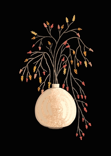 "Branches, Berries And A Vase 2" poster by Edita Brus. A minimalist digital painting that radiates warmth and calmness. Twigs adorned with vibrant berries burst from a soft beige vase, set against a striking black background. The color palette of orange, yellow, and red pops, creating a cozy vibe that effortlessly complements any space—especially those embracing the Japandi aesthetic. Perfect for adding a touch of nature-inspired tranquility to your home, this artwork invites relaxation and a sense of balance.