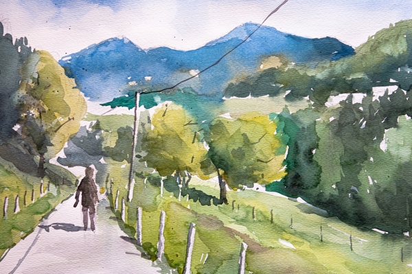 "Watercolor painted outdoors, landscape on the Samerberg, Rosenheim district Obb."