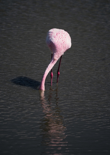 "Flamingo looking for fish underwater. The pink feathers create a contrast to the dark water."