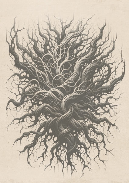 "Roots" poster by Nordlys Atelier. Dive into the intricate dance of 'Roots' – where black and white collide in a mesmerizing display of nature's hidden stories. Each twist and turn of the roots reveals a world beneath the surface, pulsing with life and mystery. It's like a visual whisper of the forest's secrets, inviting you to explore the depths of existence. This artwork captures the essence of organic beauty and the eternal flow of life, making it a striking addition to any space.