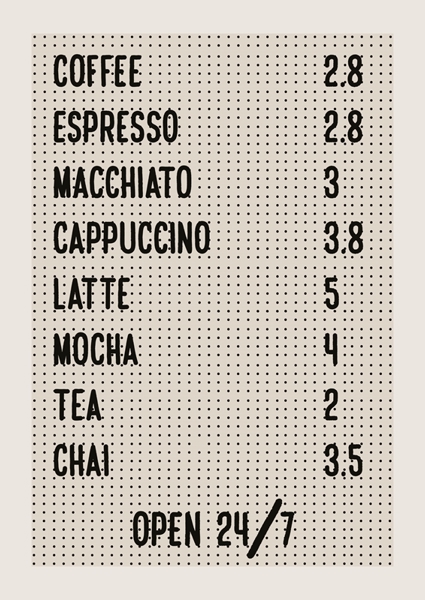 "Café Coffee Menu" poster by Lars Gustafsson. This stylish café coffee menu poster is a must-have for any coffee enthusiast. Set against a soft beige background, it features a clean, modern layout that lists delicious options like espresso, macchiato, and chai. The playful typography adds a contemporary vibe, making it perfect for kitchen decor or café walls. With its elegant yet practical design, this artwork invites you to indulge in your favorite brews—24/7. Perfect for sparking conversations and cravings alike!