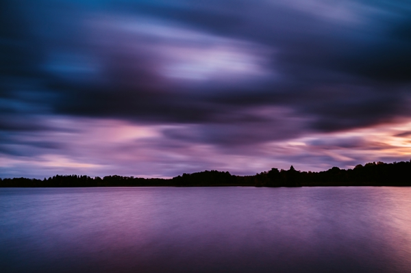 " A stunning photograph captures a serene sunset scene over a tranquil lake. The sky, awash with vibrant hues of violet and purple, is accentuated by the long exposure, creating a smooth, almost ethereal quality in the clouds. The lake mirrors the colorful sky, its surface appearing glassy and calm."