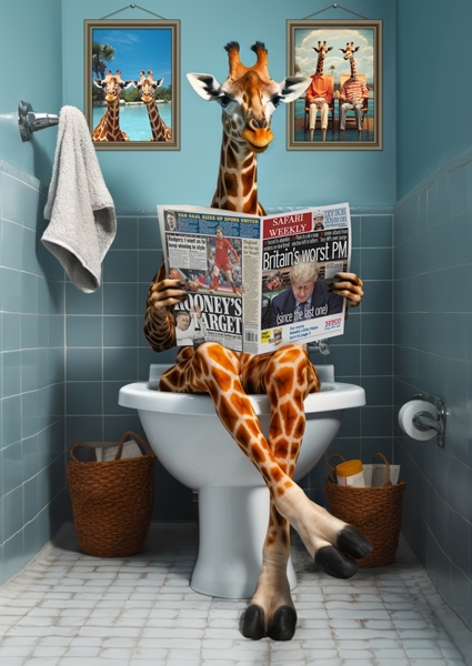 "Giraffe on the Toilet" poster by Craig Doogan. A giraffe, casually perched on a toilet, engrossed in Safari Weekly – now that’s a scene! This digital artwork blends humor and wildlife in a quirky bathroom setting. With its playful vibe, it’s perfect for animal lovers who appreciate a good laugh. The giraffe’s long legs and relaxed pose add to the charm, making it a standout piece for anyone looking to add a touch of whimsy to their space. Ideal as a gift or a fun conversation starter!