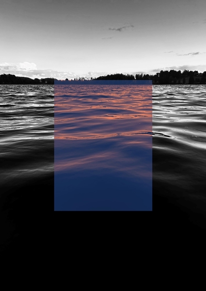 "Lake View" poster by Thrivewithus. A tranquil lake scene, where the shimmering water dances in shades of black, white, and grey, interrupted by a bold splash of orange and blue. The edited effect creates a surreal vibe, pulling you into a peaceful evening in Småland. It’s like nature’s own abstract painting – calm yet striking. Perfect for those who appreciate the beauty of simplicity and the art of contrast. Dive into this serene moment and let it transform your space.