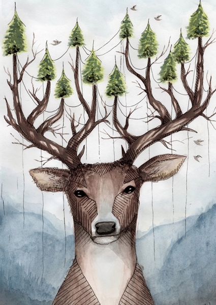 "Deer with an enchanted forrest growing from its antlers. Created in paint and fine liner"