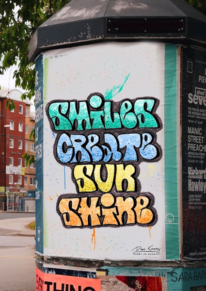 "Smile" poster by Diana Kromrey. Bright and bold, this graffiti artwork screams positivity. The playful lettering dances across the canvas, splashed with vibrant colors that pop against the backdrop. It's not just a visual treat – it’s a reminder that smiles create sunshine in our lives. Perfect for any space that needs a little lift, this piece brings a fresh, urban vibe that resonates with anyone who believes in the power of a smile. Add a dash of cool to your walls!