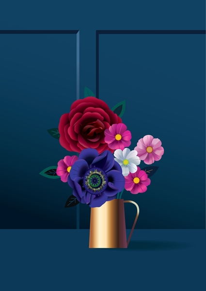 "Vector Still Life Art Bouquet with blue anemone, red rose and cosmos flowers"