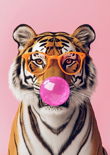 "A fun and vibrant artwork featuring a tiger wearing bright orange glasses and blowing a bubblegum bubble. This humorous and whimsical piece adds a pop of color and personality to any space."